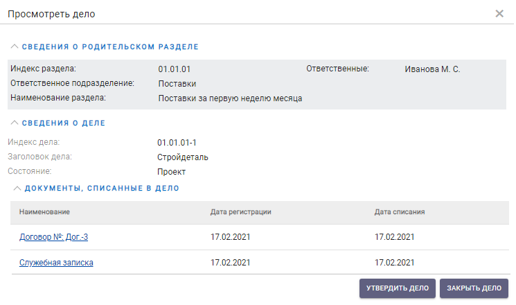 В окне информации о деле отображаются Сведения о родительском разделе, Сведения о деле и Документы, списанные в дело.