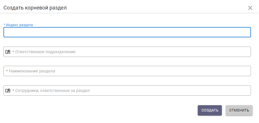Имя раздела. Частично заполняется автоматически при указании ответственного за раздел подразделения. Наименование раздела не наследуется дочерними элементами. |