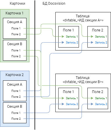 Физически экземпляры карточек хранятся в БД Docsvision в таблицах dvtable_{ID-секции}. В каждой таблице хранятся данные одной секции всех карточек одного типа. Описание, общая и системная информация о карточке хранятся в отдельных таблицах: dvsys_instances, dvsys_instances_date и некоторых других.