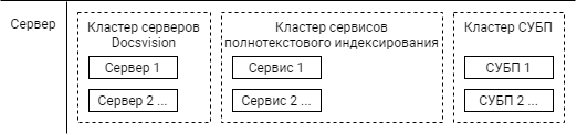 Сервер Docsvision, СУБП и Сервис полнотекстового индексирования могут масштабироваться. Для этого несколько элементов одного типа объединяются в кластер.