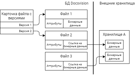 Карточки файлов с версиями и атрибуты файлов хранятся в БД Docsvision, а бинарные данные могут храниться в БД или в отдельном хранилище вне БД Docsvision. Более подробно внешнее хранение бинарных данных рассмотрено в пункте Хранение бинарных данных файлов.