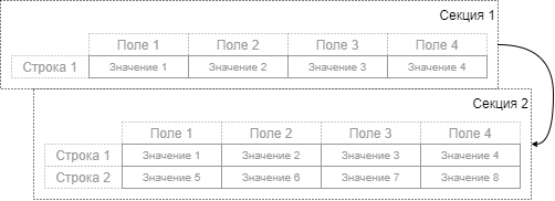 В секции может храниться одна или несколько отдельных строк с данными полей секции.