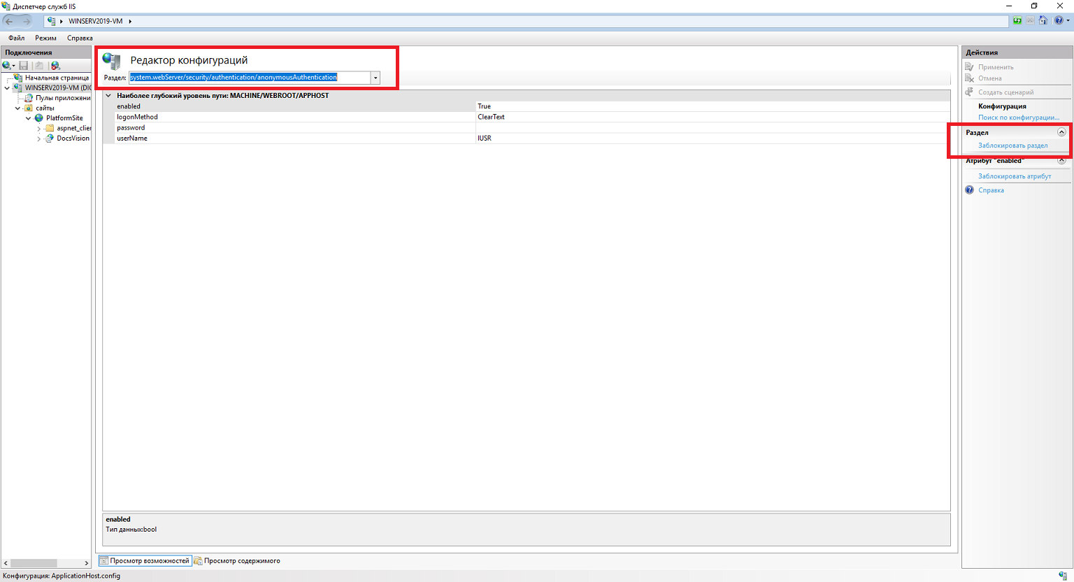 Укажите путь до раздела конфигурации: system.webServer/security/authentication/anonymousAuthentication.